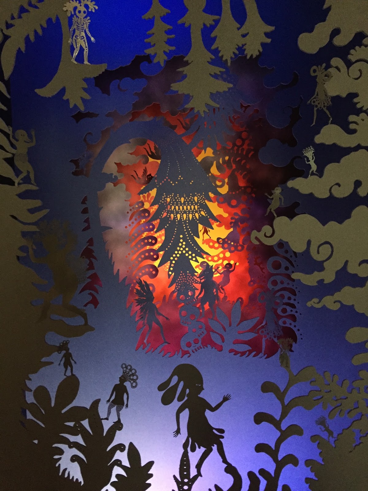 This is actually layers of cut paper, set a few inches in front of one another, with colored lights shining in between. Isn’t it amazing? It’s called a tunnel book.